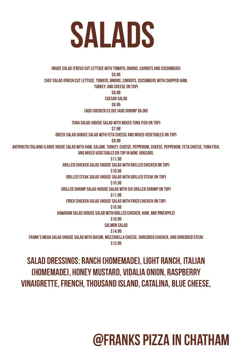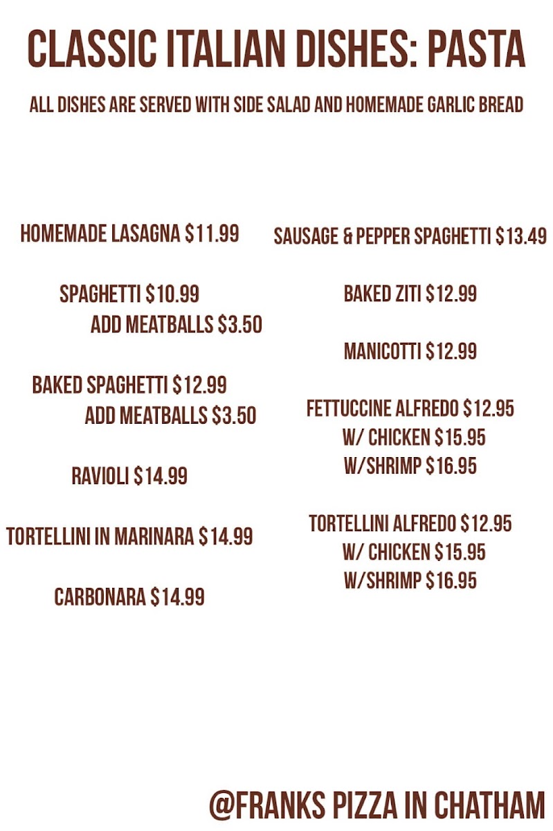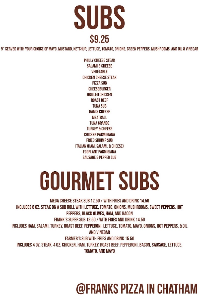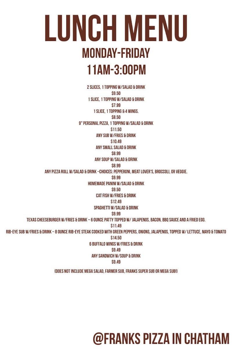Expect a welcoming environment where even a sudden stop feels special, thanks to attentive staff and great happy hour specials. Whether you’re a passing visitor or a local, Frank's Pizza Chatham promises a culinary experience that is not only delicious but also memorable. Every meal comes out hot and fresh, reflecting their commitment to quality. Don't miss out on this hidden treasure!